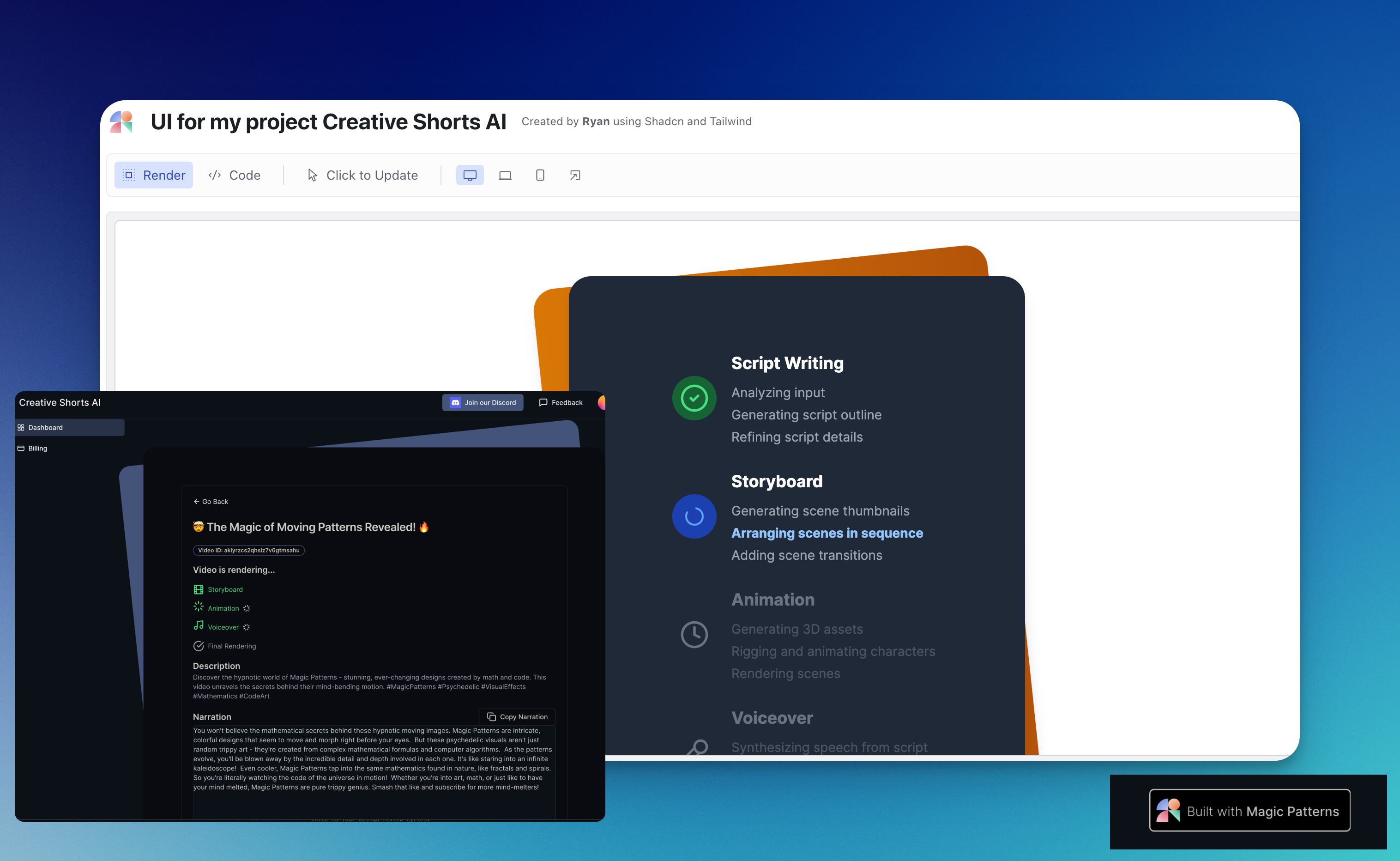 Thanks to Magic Patterns, I was able to launch Creative Shorts AI about 1 month faster. My landing page, footer, dashboard, billing, loading skeleton, and 8 more pages were all created using Magic Patterns. This shaved off weeks of development time and allowed me to focus on polishing the product. Magic Patterns is such a huge timesaver, allowing me to create skeletons, success states, and error states in mere seconds.